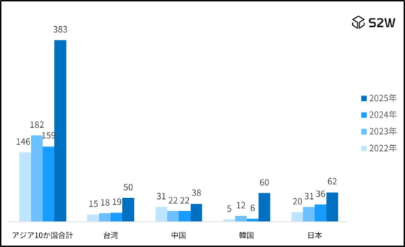 国別では、日本が2023年以降アジア最多を継続。韓国も前年比10倍(6件→60件)と突出した増加を記録しており、東アジアを中心に脅威が急速に拡大している。
