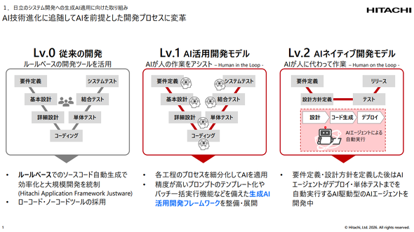 日立製作所 白井氏 現状、ウオーターフォールの各工程にAIアシスタントが対応する“レベル1”として提供していますが、“レベル2”として、最近話題のAI駆動型開発についても研究を進めています。“レベル2”では、要件定義書と設計方針定義書さえ用意すれば、後はAIエージェントが自律的に開発を進め、テストまで実施してくれるようになり、開発効率の大幅な向上が期待できます。