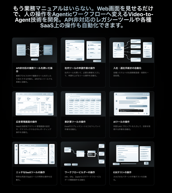 1つ目はアクセス経路の拡張で、WebアプリケーションだけでなくAPI、CLI(コマンドラインインタフェース)、MCP(Model Context Protocol)を介した他AIからのCopelfエージェント操作。2つ目は操作対象の拡張で、Webブラウザ操作にとどまらずPC自体の操作、ヒューマノイドロボットの動作制御まで視野に入れているという。