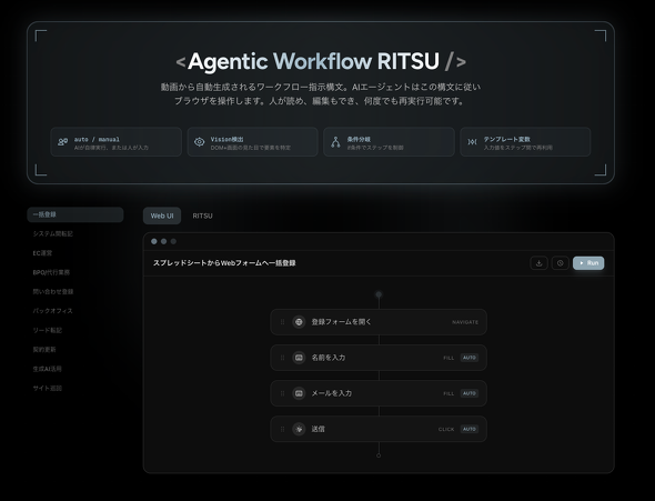 Copelfでは同社が開発したAIエージェントへ作業手順を正確に伝達するための汎用(はんよう)指示構文「Agentic Workflow RITSU」(以下、RITSU)を採用している。録画から解析されたワークフローはRITSUに基づいて構造化され、AIエージェントが再現可能な形で実行される。