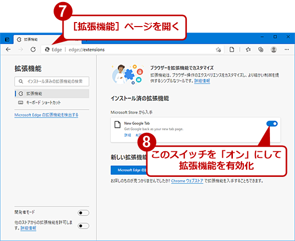 [機能拡張]ページ(edge://extensions/)が開いたら、「インストール済みの拡張機能」欄の「New Google Tab」のスイッチを「オン」にする。削除したい場合は、[削除]リンクをクリックすればよい。
