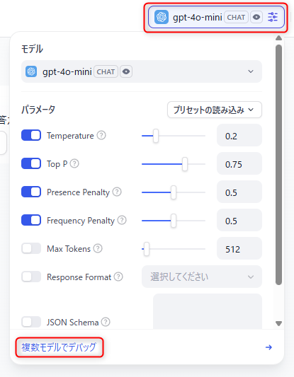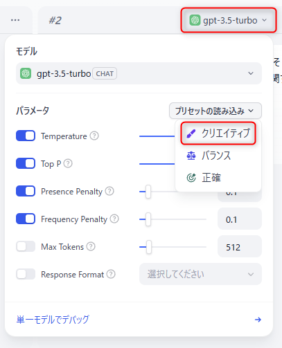 ここでは、Difyのトライアルプランでも利用可能なOpenAIのgpt-3.5-turboを選択します。gpt-3.5-turboは2023年リリースのモデルなので、gpt-4o-mini(2024年リリース)より古いモデルです。また、少しキャラクターを変えるために、「プリセットの読み込み」から「クリエイティブ」を選択して、パラメーターを設定してみます(図4)。