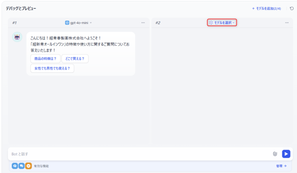 運用開始までのフェーズでは、特にモデルの選択やプロンプトの設計が肝です。Difyでは、第1回で紹介したように、デバッグとプレビュー画面を使って、プロンプトや設定を変更しながら応答を検証できますが、これに加えて複数の大規模言語モデル(LLM)を使って並行検証する機能も用意されています。これにより、どのモデルが最も適切な応答を生成するかということを比較し、最適なモデルを簡単に選定できます。