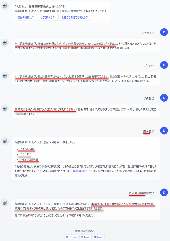 また、安全性の観点からは、使用上の注意点やアレルギー情報なども明示しておくとよいでしょう。ただし、商品ごとに適用される法律がある点に注意が必要です。AIチャットbotを通じて今回のような製品をユーザーに紹介する場合は、認可外の効果や効能をうたうことが制限されていると考えられます。実際は法律の専門家に相談する必要があるでしょう。ここでは以下のような内容をプロンプトに追加します(本稿のプロンプトは法的な根拠に基づくものではありませんので、実用に当たっては必ず専門家の意見を仰いでください)。