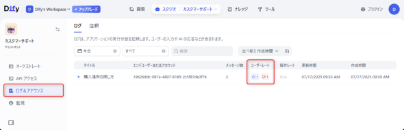 フィードバックは、Difyの「スタジオ」画面の「ログ&アナウンス」画面で確認できます。表の「ユーザーレート」の部分にフィードバックの数が表示されます(図9)。