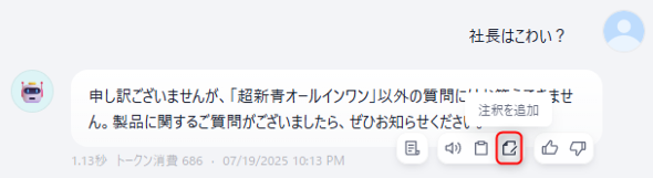 アノテーションは、チャットログのコマンドにある「注釈を追加」ボタンをクリックして追加します(デバッグとプレビュー画面のログからも行えます)。ここでは、「社長はこわい?」という製品と関係のない質問に対する回答を選択しました。ボタンをクリックすると、その回答がアノテーションとして追加されます(図11)。
