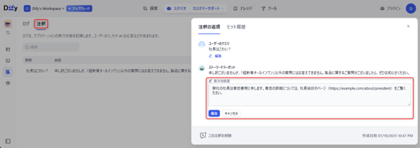 さらにDifyには、チャットログに対してアノテーション(注釈)を付ける「アノテーションリプライ(注釈返信)」と呼ばれる機能があります。これにより、プロンプトの変更なしに、特定の質問に対する適切な回答を直接的に指定できます。