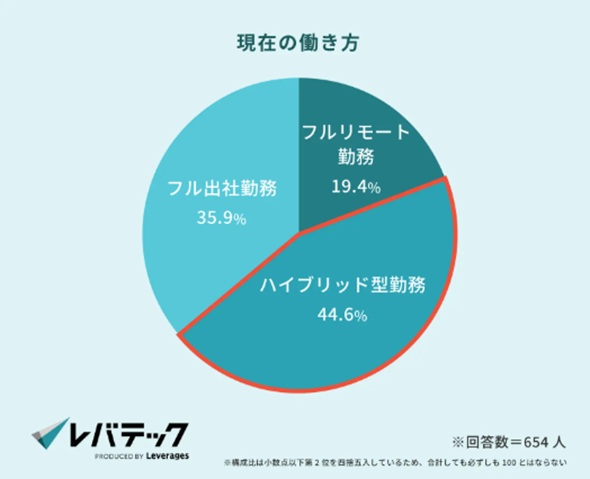 現在の勤務形態について聞くと、テレワークと出社を組み合わせる「ハイブリッド型勤務」が最多で44.6%。そのうち、「週2〜3日出社する」と答えた人は45.2%を占めた。