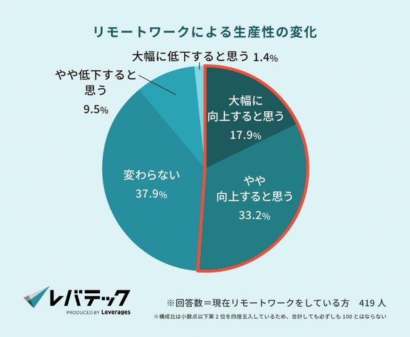 テレワークによる業務生産性の変化については37.9%が「変わらない」と回答しており、こうした結果が出社回帰を促している可能性はある。ただし、レバテックは「『大幅に向上』(17.9%)と『やや向上』(33.2%)を合わせると5割を超え、生産性向上を実感する層も多い」と指摘している。