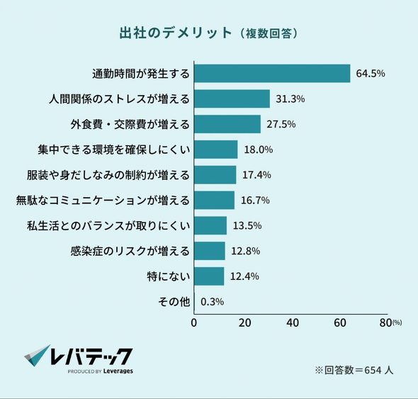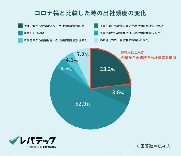 コロナ禍と比較すると、23.2%が「所属企業の要請によって出社頻度が増加した」と回答し、レバテックは「出社回帰の動きが少なからず見られる」と分析している。