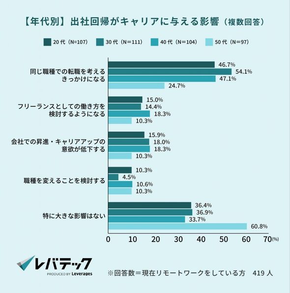 こうした「テレワークへの期待」は仕事へのモチベーションにもつながっているようだ。現在テレワークを実施している人に「今後勤務先が出社回帰の方針を打ち出した場合、キャリアプランにどのような影響を与えるか」と聞いたところ、43.7%が「同職種での転職を検討する」と回答した。回答者の年代を30代に限定すると過半数(54.1%)が転職の意思を示した。