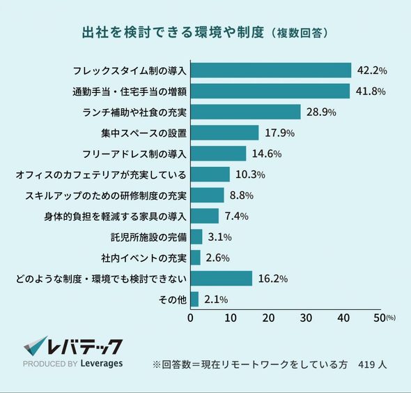 テレワーク実施者に、もしフル出社勤務に切り替わるとして、どのような環境や制度があれば出社するかと訪ねたところ、「フレックスタイム制導入」(42.2%)や「通勤、住宅手当増額」(41.8%)などが上位に並んだ。一方、16.2%は「どのような制度でも検討できない」と回答し、テレワーク勤務への強いこだわりも見られた。