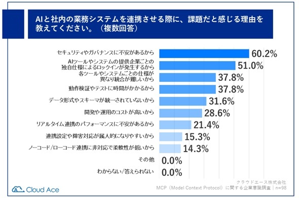そもそもの課題として、AIと業務システムを連携させることについて懸念を持っている企業は多く、調査対象のうち、37.3%が「非常に感じる」、51.8%が「やや感じる」と回答した。具体的な課題(懸念)について聞くと、「セキュリティやガバナンスに不安があるから」(60.2%、複数回答、以下同)、「AIツールやシステムの提供企業ごとの独自仕様によるロックインが発生するから」(51.0%)、「ツールやシステムごとの仕様が異なり統合が難しいから」(37.8%)などが上位に並んだ。
