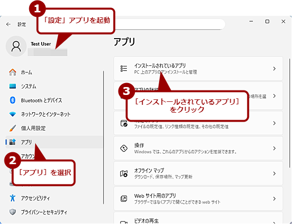 それには、「設定」アプリを起動し、[アプリ]−[インストールされているアプリ]を選択して、「インストールされているアプリ」画面を開く。