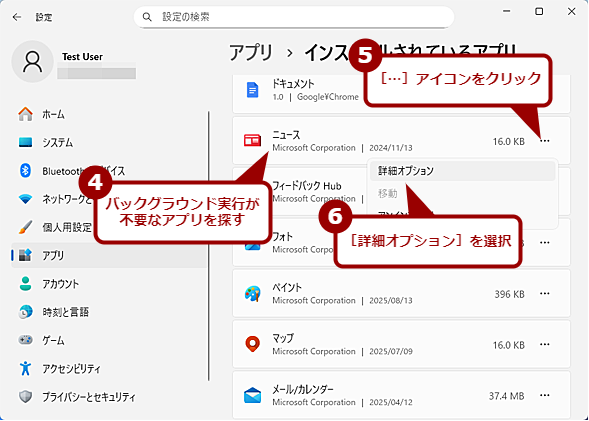 ここにインストールされているアプリの一覧が表示されるので、アプリ名の右側にある[…]アイコンをクリックして、表示されたメニューの[詳細オプション]を選択する。[詳細オプション]が表示されないアプリは、バックグラウンドで実行されていないかどうか、設定が変更できないものだ。