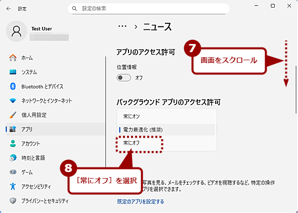 [詳細オプション]を選択すると、そのアプリの詳細設定が表示されるので、「バックグラウンドアプリのアクセス許可」欄にあるプルダウンリストで[常にオフ]を選択すればよい。Windowss 11の再起動後、このアプリはバックグラウンドで実行されなくなる。