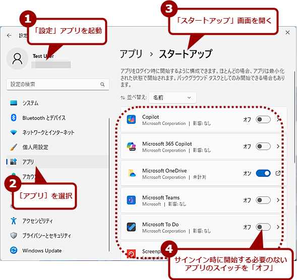Windows 11にサインイン後に自動的に起動する「スタートアップアプリ」が多過ぎると、起動時間が長くなるだけでなく、PCの動作が重くなる原因にもなる。