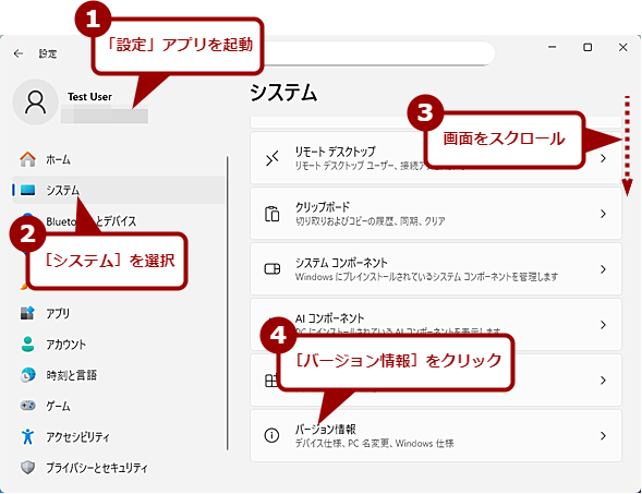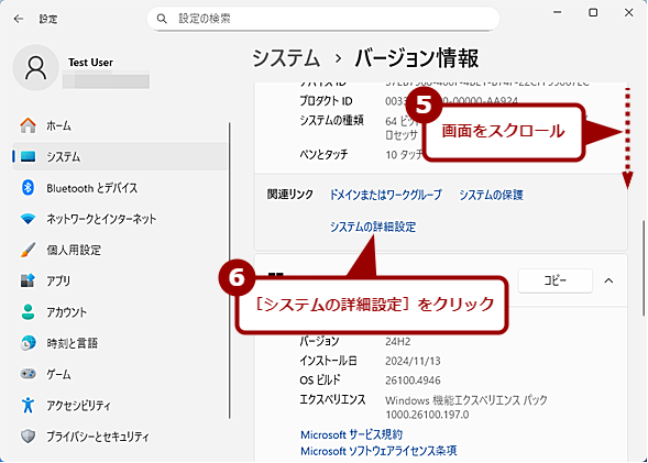 「設定」アプリの[システム]−[バージョン情報]をクリックして、「バージョン情報」画面を開き、画面中ほどにある「関連リンク」欄の[システムの詳細設定]リンクをクリックする。もしくは、タスクバーの検索入力ボックスに「システムの詳細」と入力し、検索結果に表示された「システムの詳細設定の表示」をクリックしてもよい。