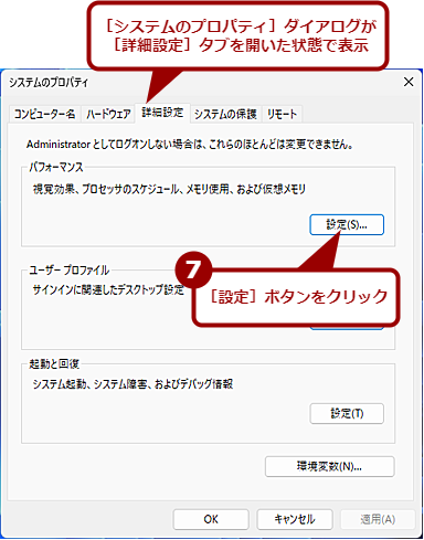[システムのプロパティ]ダイアログが[詳細設定]タブを開いた状態で表示されるので、ここの「パフォーマンス」欄にある[設定]ボタンをクリックする。[パフォーマンスオプション]ダイアログが開いたら、[視覚効果」タブを選択し、「パフォーマンスを優先する」を選択する。これで、視覚効果が全て「オフ」になるので、「スクリーンフォントの縁を滑らかにする」など必要な項目にチェックを入れて、[OK]ボタンをクリックすればよい。