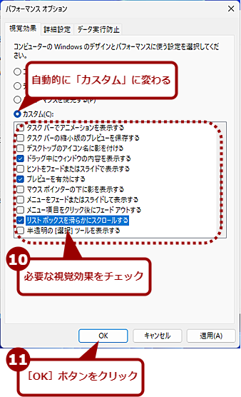 ちなみに筆者が「オン」にしている項目は、次の5つだ。視覚効果は好みの部分もあるので、いろいろと試してみて最低限必要な項目のみにチェックを入れるようにするとよい。