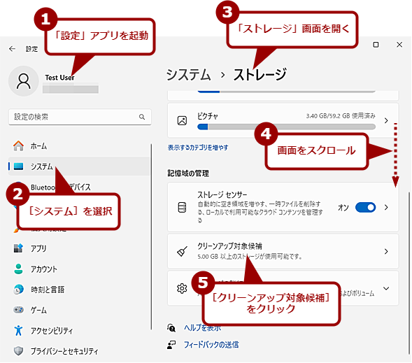 ここでは「設定」アプリにある「ストレージセンサー」を使う方法のみ簡単に紹介しておこう。「設定」アプリを起動したら、[システム]−[ストレージ]を選択して、「ストレージ」画面を開き、「記憶域の管理」欄にある[クリーンアップ対象候補]をクリック、「クリーンアップ対象候補」画面を開く。