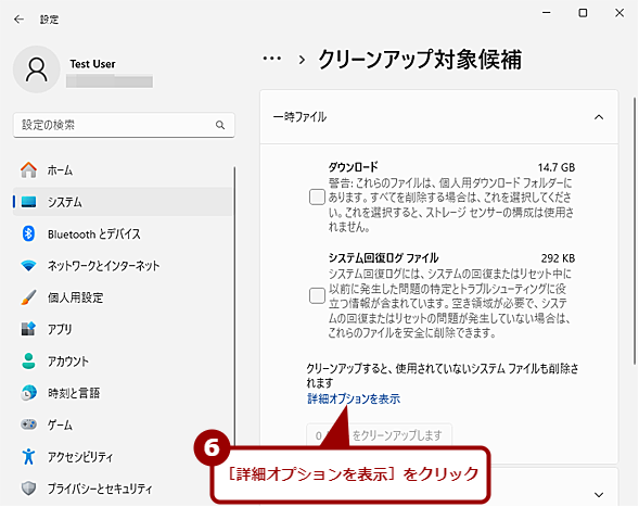 ここでは、ストレージセンサーを使って、「一時ファイル」をまとめて削除する方法を紹介する。「設定」アプリを起動して、[システム]−[ストレージ]を選択、「ストレージ」画面を開き、「記憶域の管理」欄にある[クリーンアップ対象候補]をクリックする。