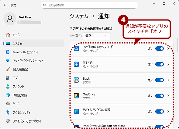 「設定」アプリを起動し、[システム]−[通知]を選択して、「通知」画面を開く。「通知」欄のスイッチを「オフ」にすると、全ての通知を「オフ」にできる。アプリごとに通知を設定したい場合は、「アプリやその他の送信者からの通知」欄でアプリごとにスイッチを「オフ」にすればよい。