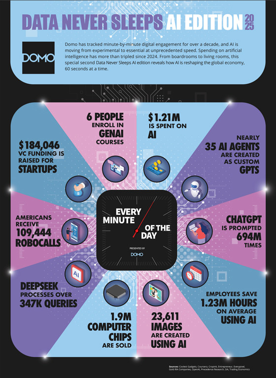 Domoは、インターネット上で毎分生成された膨大なAIデータの利用状況や、AIが日常生活にもたらしている影響を分析し、その調査結果を「2025 Data Never Sleeps:AI版」として発表した。