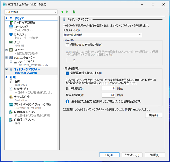 ここでは、仮想マシンに対するQoS機能である「最小帯域幅保証」と「最大帯域幅制御」について取り扱いますが、これらをどこで設定するかというと、本連載第5回でも触れた通り、仮想マシンの「仮想ネットワークアダプター」で設定します(画面1)。