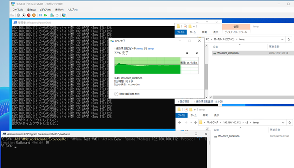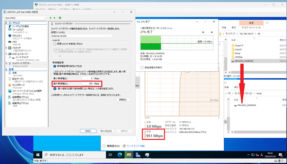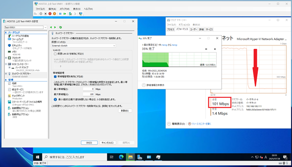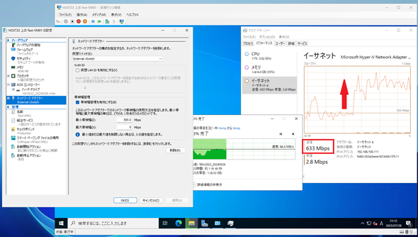 画面2や画面3は、仮想マシンからネットワーク上のノードにファイルをアップロードした際(トラフィックとしてはアウトバウンド方向)の画面になっています。仮想マシンへファイルをダウンロードした場合は、トラフィックを受ける側(イングレス方向〈インバウンド方向〉)になるため、ファイル(トラフィック)を送出する側がQoS設定を行っていなければ、帯域制限を受けることはありません(画面5)。