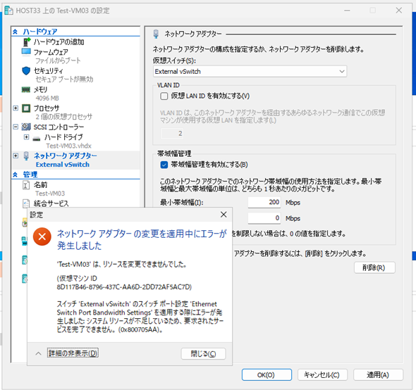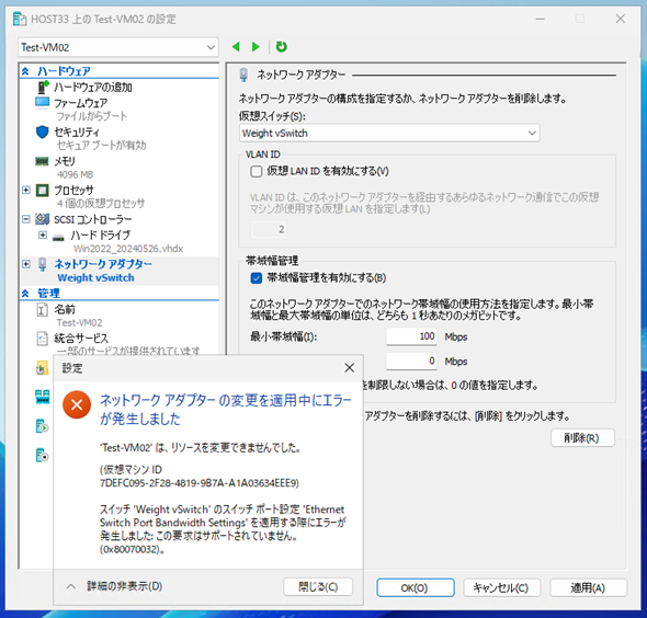 Hyper-Vマネージャーから同様の設定をした場合にも、「重み付け(Weight)」の仮想スイッチに対して絶対値での設定は不可能であるため、画面10のエラーが発生します。