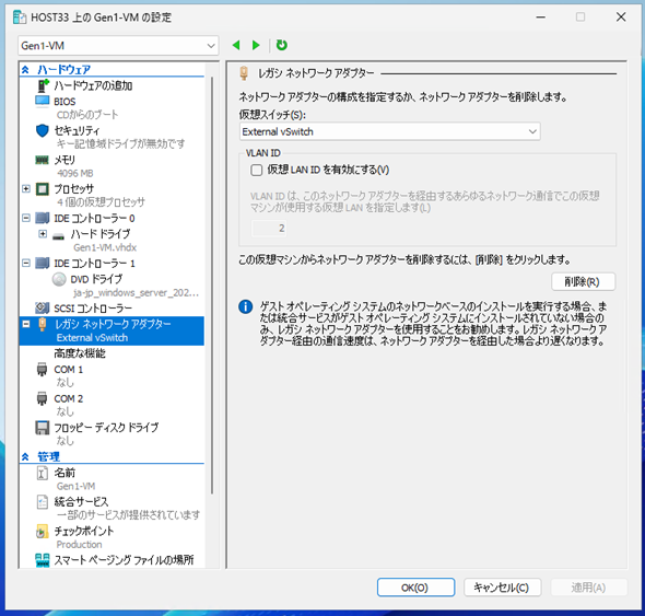 レガシーネットワークアダプターを使用しなければならないシナリオは多くないと思いますが、仕様として覚えておいた方がよいでしょう。