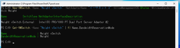 New-VMSwitch -Name "Weight vSwitch" -NetAdapterName "イーサネット 3" -AllowManagementOS $false -MinimumBandwidthMode Weight