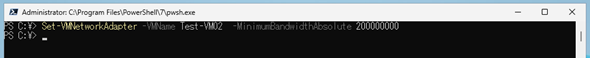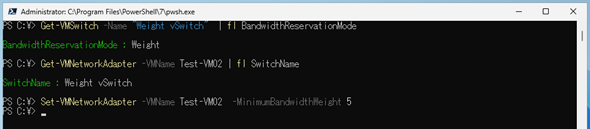 「重み付け(Weight)」の最小帯域幅はWindows PowerShellからのみ設定可能で、「Set-VMNetworkAdapter」コマンドレットで「-MinimumBandwidthWeight」オプションを使用します(画面11)。