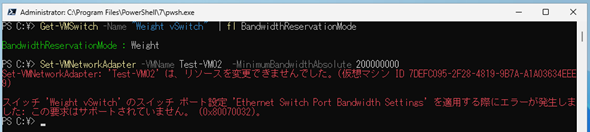 画面8は絶対値の最小帯域幅設定でしたが、これは接続している仮想スイッチの「MinimumBandwidthMode」が「絶対値(Absolute)」の場合に設定可能です。「MinimumBandwidthMode」が「重み付け(Weight)」の場合は、画面9のエラーが発生します。
