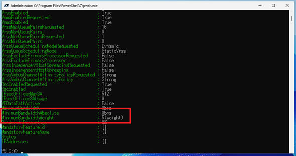 仮想ネットワークアダプターの設定内容の確認は、「Get-VMNetworkAdapter」コマンドレットを実行し、「MinimumBandwidthAbsolute」や「MinimumBandwidthWeight」の値を確認します(画面12)。