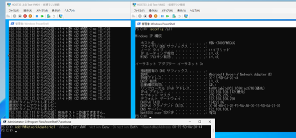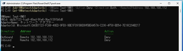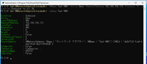 設定は「Get-VMNetworkAdapterAcl」コマンドレットで確認できます。画面13で示したACLと同じものを設定しているので、アクセス制御の挙動としては画面13と同じになります。
