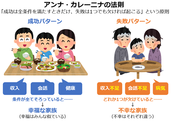 アンナ・カレーニナの法則(Anna Karenina principle)とは、「成功するためには必要条件を全て満たさねばならないが、失敗は一つの欠陥で簡単に起こる」という原則である。この名称は、ロシアの文豪レフ・トルストイ(Leo Tolstoy)氏の小説『アンナ・カレーニナ』の冒頭の一文「幸福な家族はみんな似たようなものだが、不幸な家族はそれぞれに異なる不幸を抱えている」(All happy families are alike; each unhappy family is unhappy in its own way.)に由来する(図1)。