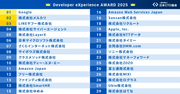 日本CTO協会は2025年7月15日、「Developer eXperience AWARD 2025」を発表し、エンジニアたちが「開発者体験が良さそうだ」と感じた企業上位30社と、そう思うに至ったポイント、それらの情報との接点を発表した。