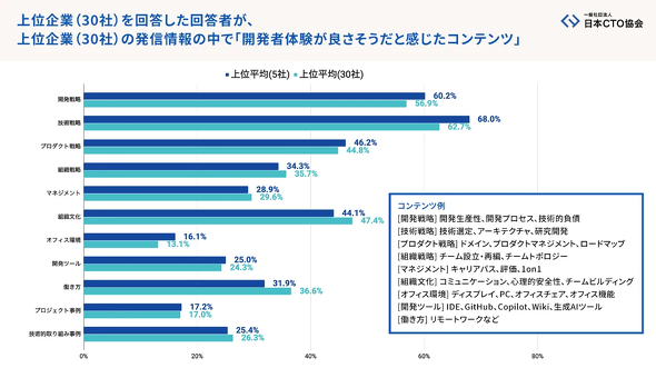 技術要素以外では、「組織戦略」や「マネジメント」「組織文化」といった項目が上位30社全体で高いポイントを得ている。心理的安全性やチームビルディング、キャリアパスなど、エンジニアが長期的に成長し続けるための要素も、「開発体験」を構成するポイント要素として重視されていることが分かった。