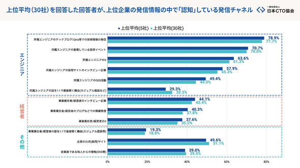 情報発信のチャネルは、テックブログやQiita、Xでの投稿の認知度が高かった。企業の公式採用サイトも半数以上のエンジニアに認知されており、外部採用サイトも含めたエンジニアのインタビュー記事は、多くのエンジニアに認知されていた。所属エンジニアの生の声や体験も、貴重な判断材料であることがよく分かる。