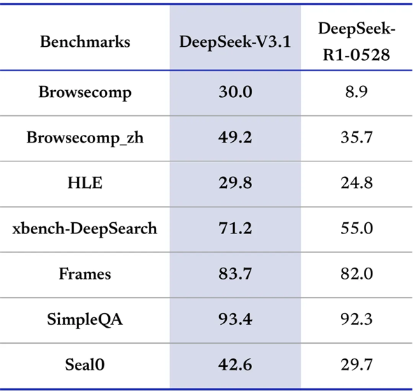 DeepSeek-V3.1の各種能力比較(公式発表資料より引用)