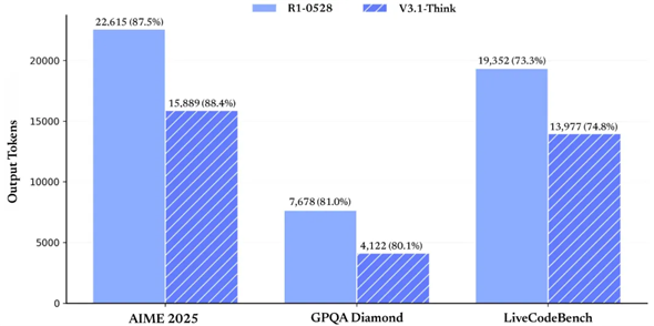 今回の新バージョン「V3.1」は、前世代のリーズニング(reasoning=思考過程)特化モデル「DeepSeek-R1」の2025年5月公開版「R1-0528」と比較しても、出力がより短くなりつつ精度は向上しており、効率化が進んだといえる。