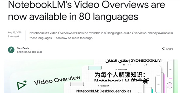 Googleは2025年8月26日、情報要約ツール「NotebookLM」の新機能を発表した。「Video Overview」の対応言語を80言語に拡大するとともに、「Audio Overview」で英語版と同等の機能が利用できるようにした。