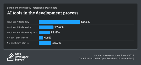 Stack Overflowが発表した年次調査「2025 Stack Overflow Developer Survey」によると、回答者の84%はAIツールを既に利用しているか、または利用を予定していると回答。さらに、プロフェッショナル開発者の51%が、日常業務においてAIツールを毎日利用している状況だという。