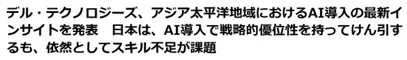 AIへの投資が活発な一方で、導入には障壁があるようだ。調査結果によるとAPAC地域では、AIプロジェクトの20%が失敗していた。その主な要因は、「AIガバナンスの不備」(19.3%)、「人材不足」(18.4%)、「過剰なインフラコスト」(16.9%)だった。特に人材に関しては企業の危機感は高いようで、APAC地域の約7割の企業が「AIスキルを有する人材不足を埋めるために、新たな人材には『データとAIの知識』を必須としている」とデル・テクノロジーズは分析している。