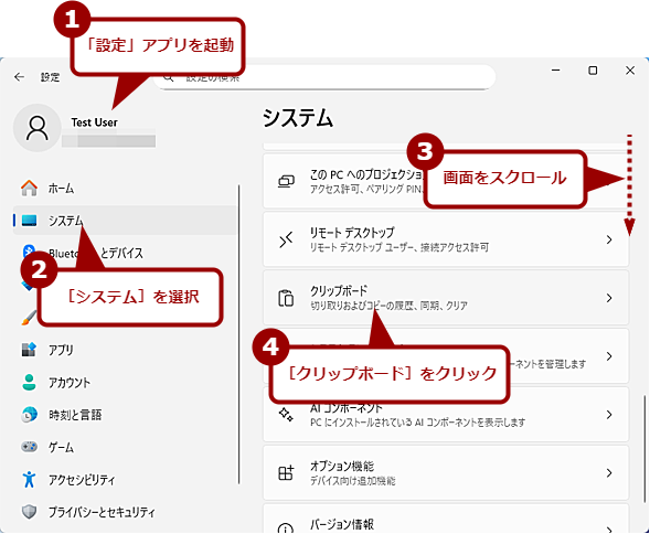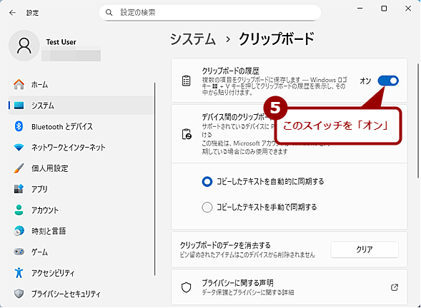 「設定」アプリを起動し、[システム]−[クリップボード]を選択して、「クリップボード」画面を開く。ここの「クリップボードの履歴」のスイッチが「オン」になっていることを確認する。ここが「オフ」になっていると「クリップボードの履歴」が使えないので、「オン」にする。これで、クリップボードには直前に[Ctrl]+[C]キーなどで保存したものだけでなく、複数のテキストや画像がクリップボードに保存できるようになる。