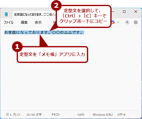 「ピン留め」するのは非常に簡単だ。「メモ帳」アプリなどで「ピン留め」したい「お世話になっております。○○の△△です。……」といったテキストを入力したら、全て選択して、[Ctrl]+[C]キーを押して、通常通りクリップボードにコピーする。