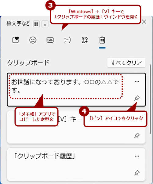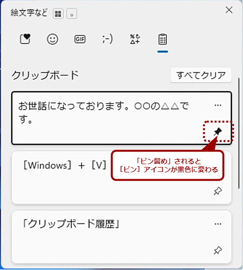 [Windows]+[V]キーを押して[クリップボードの履歴]ウィンドウを開く。「メモ帳」アプリなどでコピーした定型文の右下にある[ピン]アイコンをクリックする。