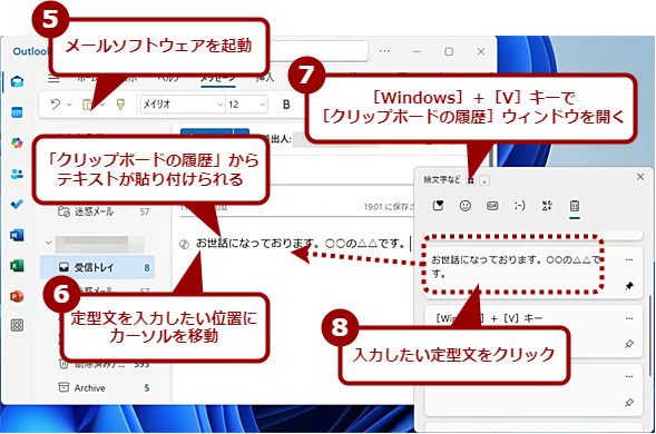メールなどに定型文を貼り付けたい場合は、貼り付けたい位置にカーソルを移動し、[Windows]+[V]キーで[クリップボードの履歴]ウィンドウを開き、定型文をクリックすればよい。これでカーソル位置に「クリップボードの履歴」から定型文が貼り付けられる。